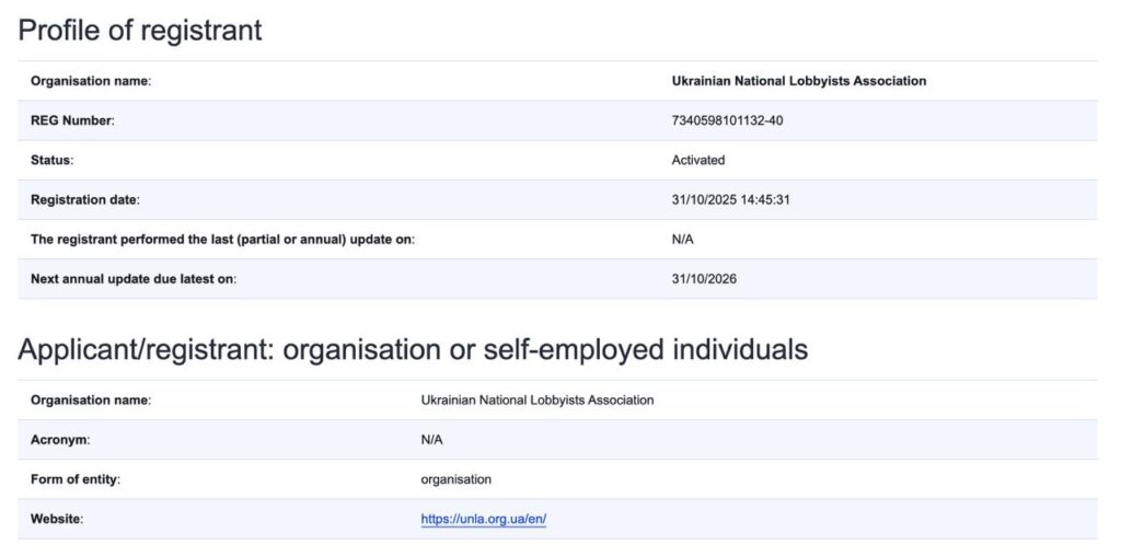 Секретаріат Реєстру прозорості ЄС підтвердив реєстрацію Ukrainian National Lobbyists Association у відкритій системі, що засвідчує відповідність організації вимогам прозорості та етичним стандартам Європейського Союзу.