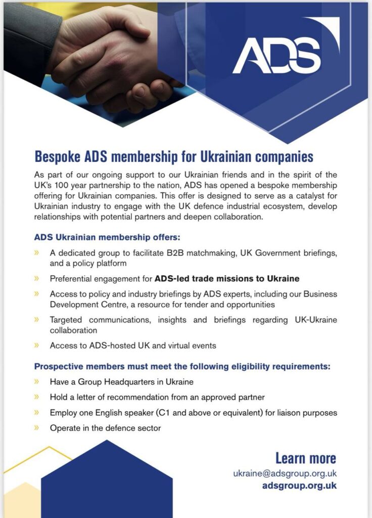 As part of its ongoing support for Ukraine and as a sign of the 100-year partnership between our countries, ADS has launched a special membership program for Ukrainian companies to facilitate their integration into the UK defense industrial ecosystem, develop partnerships and deepen cooperation.